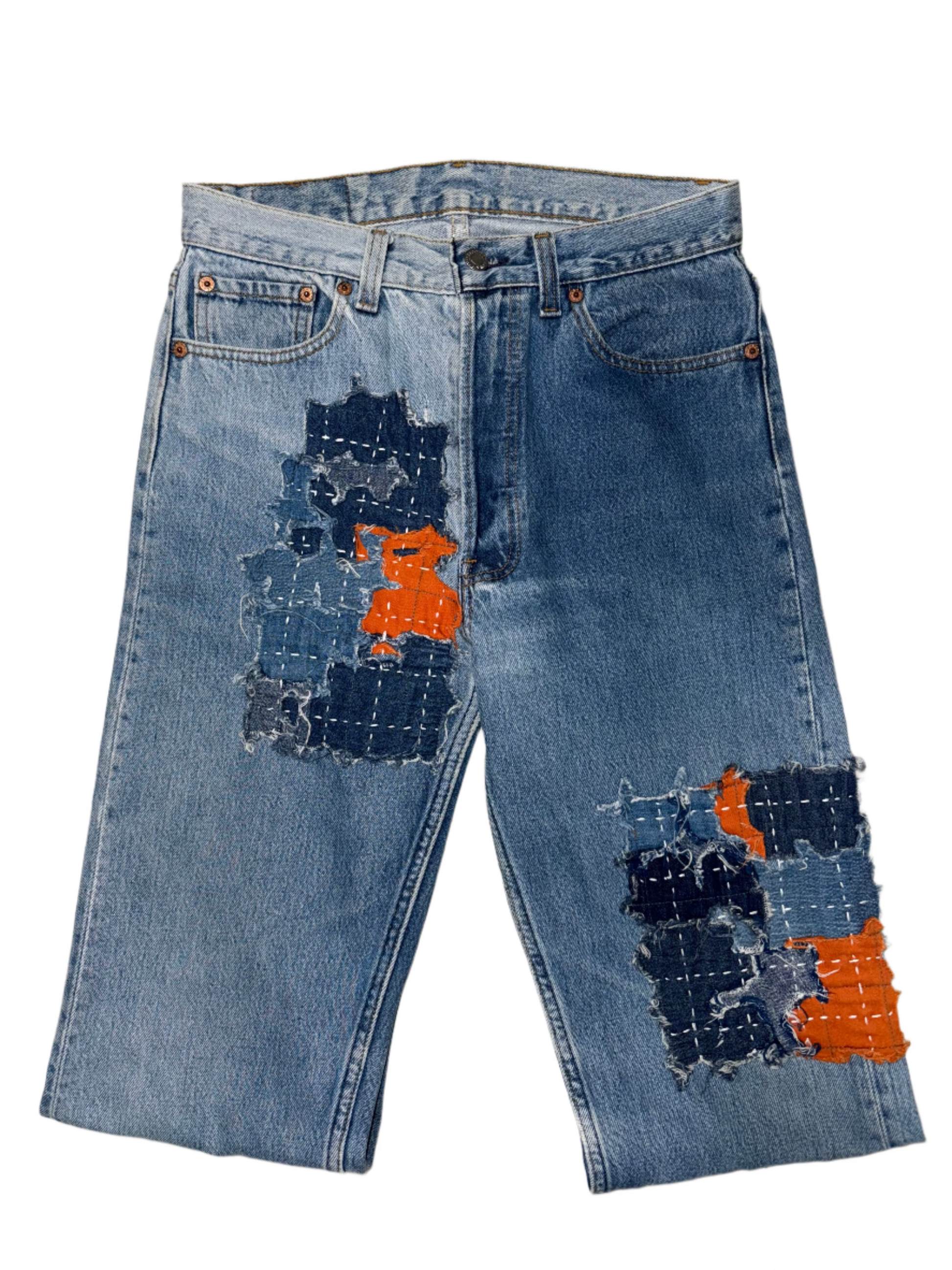 These one-of-a-kind vintage Levi’s 501 jeans feature a classic button-fly closure and are proudly Made in the USA. Enhanced with traditional Japanese boro-style patchwork, they showcase rich indigo tones and vibrant orange accents. Each patch tells a story of repair and resilience, blending heritage craftsmanship with streetwear edge.